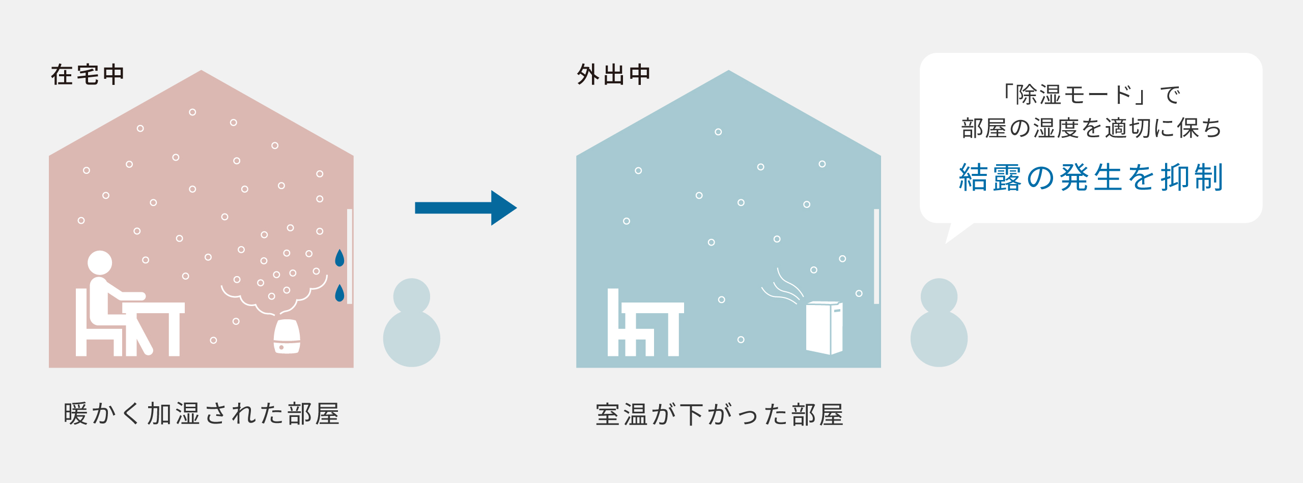 • 主な機能 室温が下がっても除湿能力が下がりにくい、デシカント式を採用。一年中快適に*5