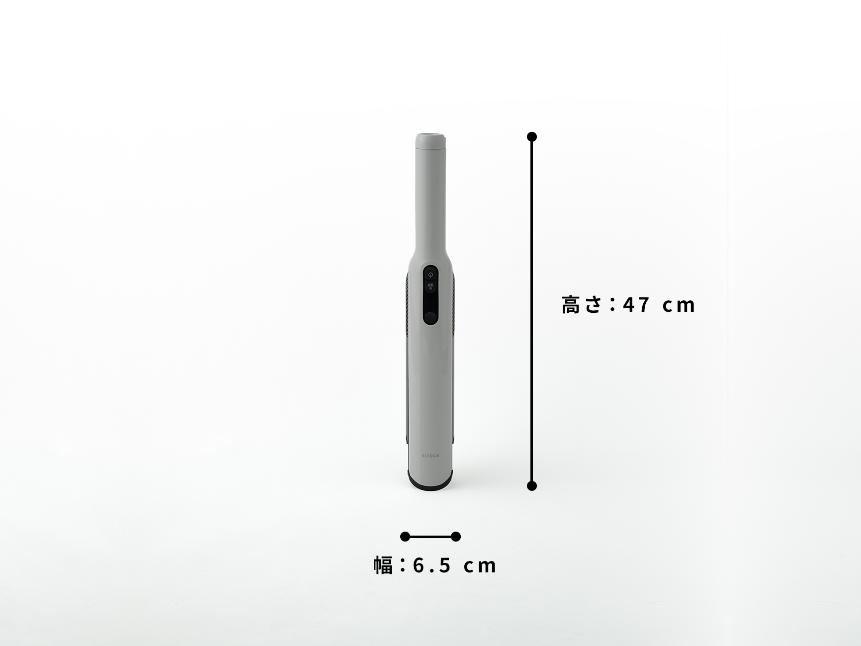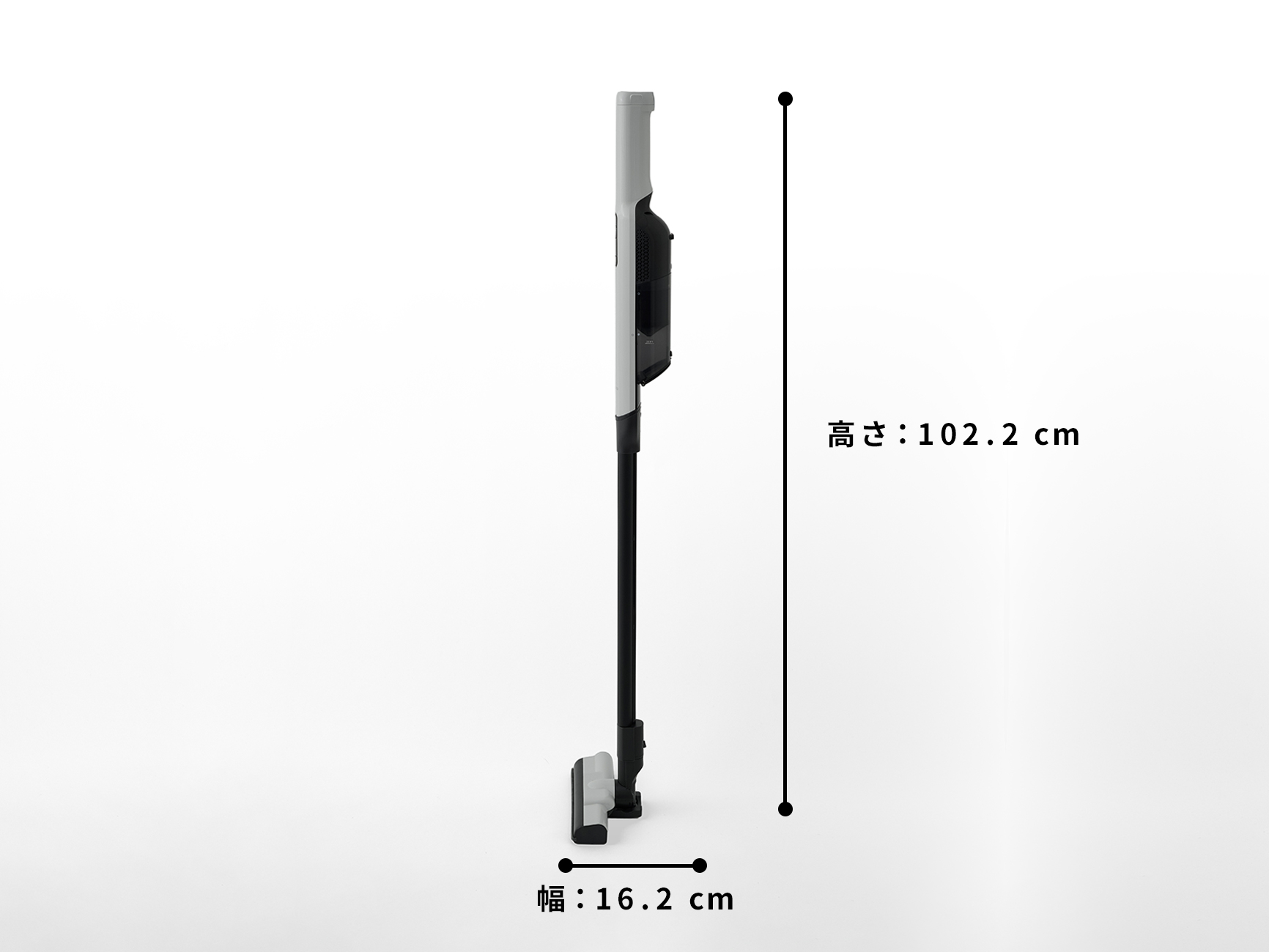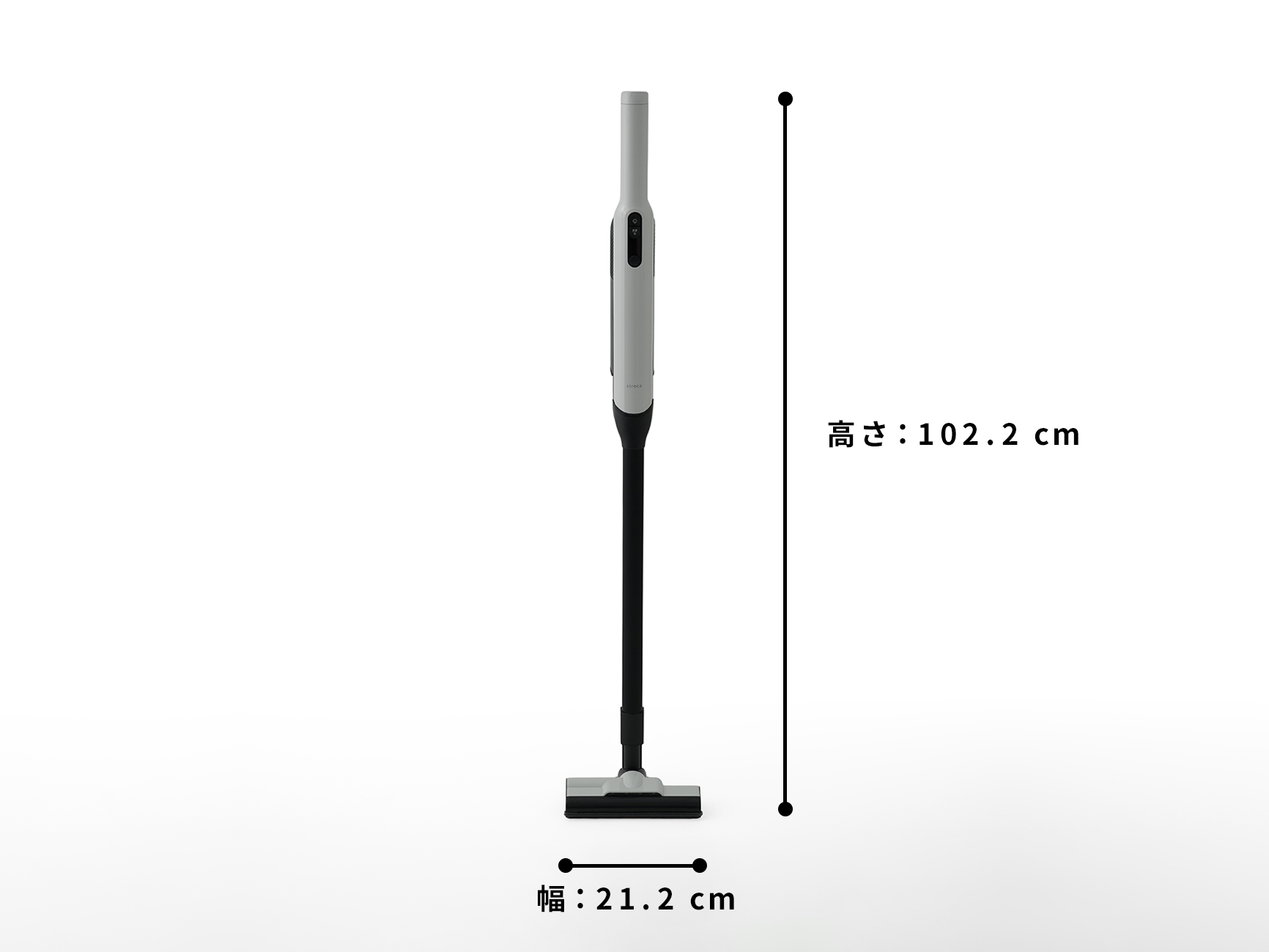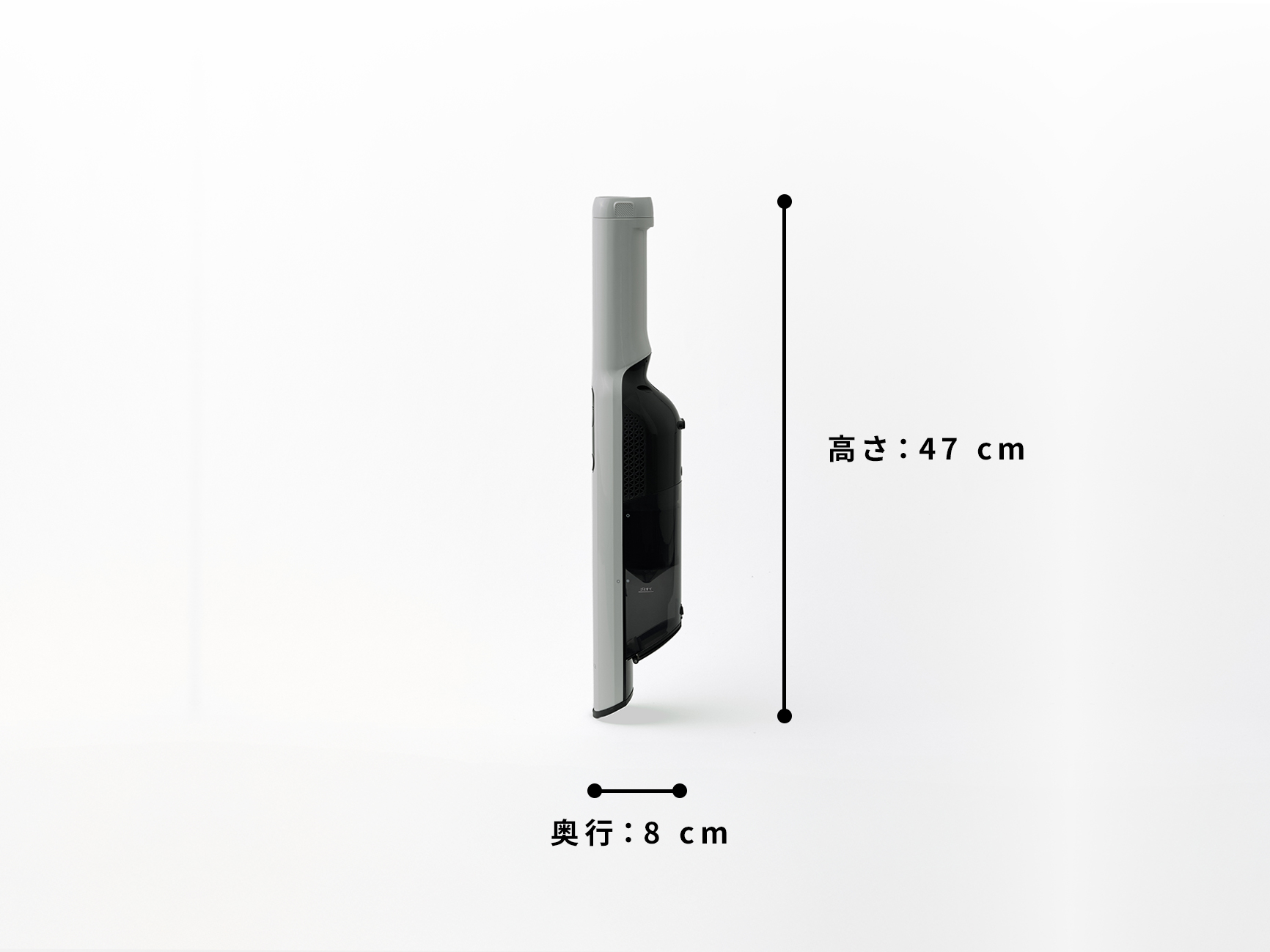 本体:幅7 cm × 奥行8 cm × 高さ42 cm 組み立て時:幅21 cm × 奥行15 cm × 高さ105.5 cm(本体+延長パイプ+フロアブラシ) |