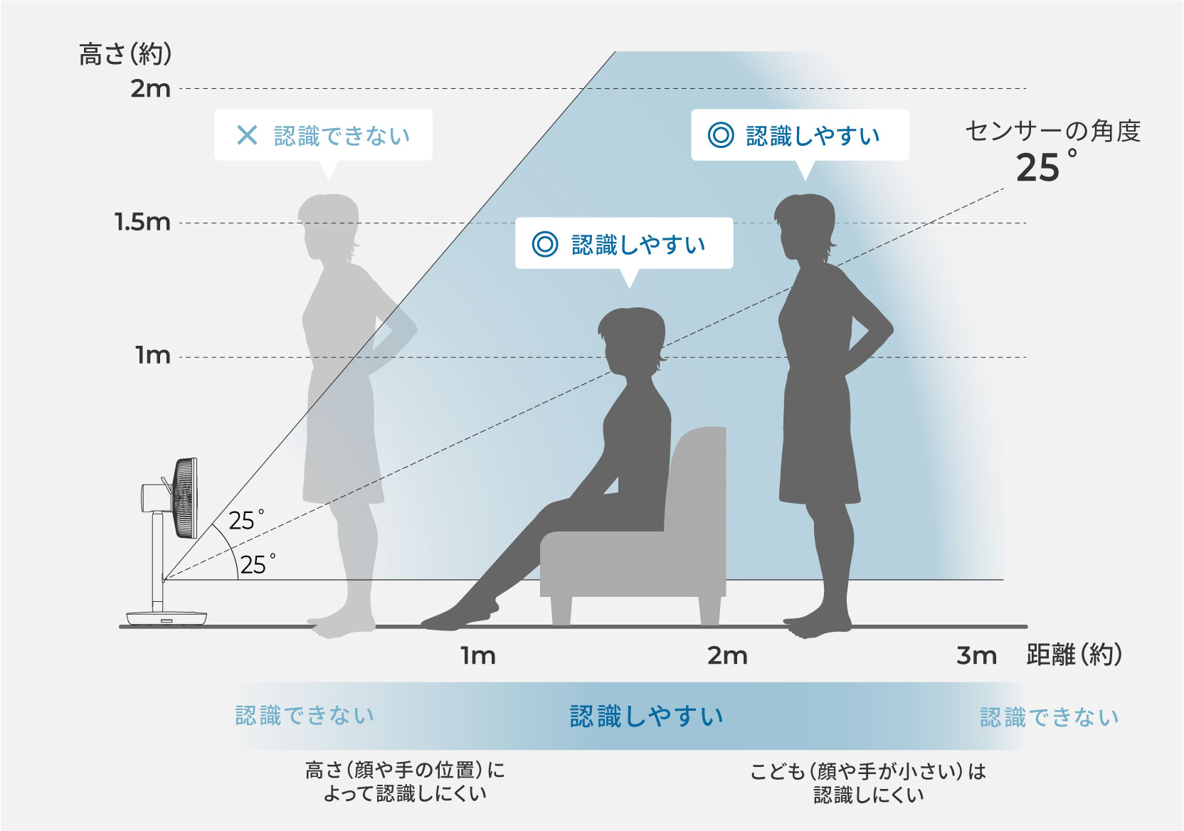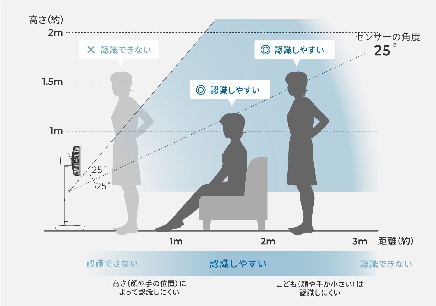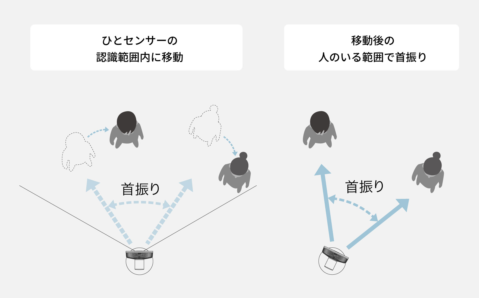 • 人を認識する「ひとセンサー」 は、⼈の肩から上(顔)の形状で識別します。