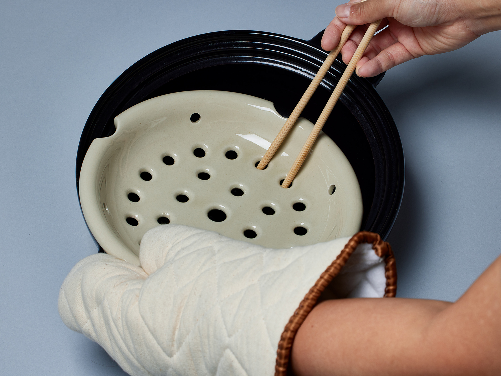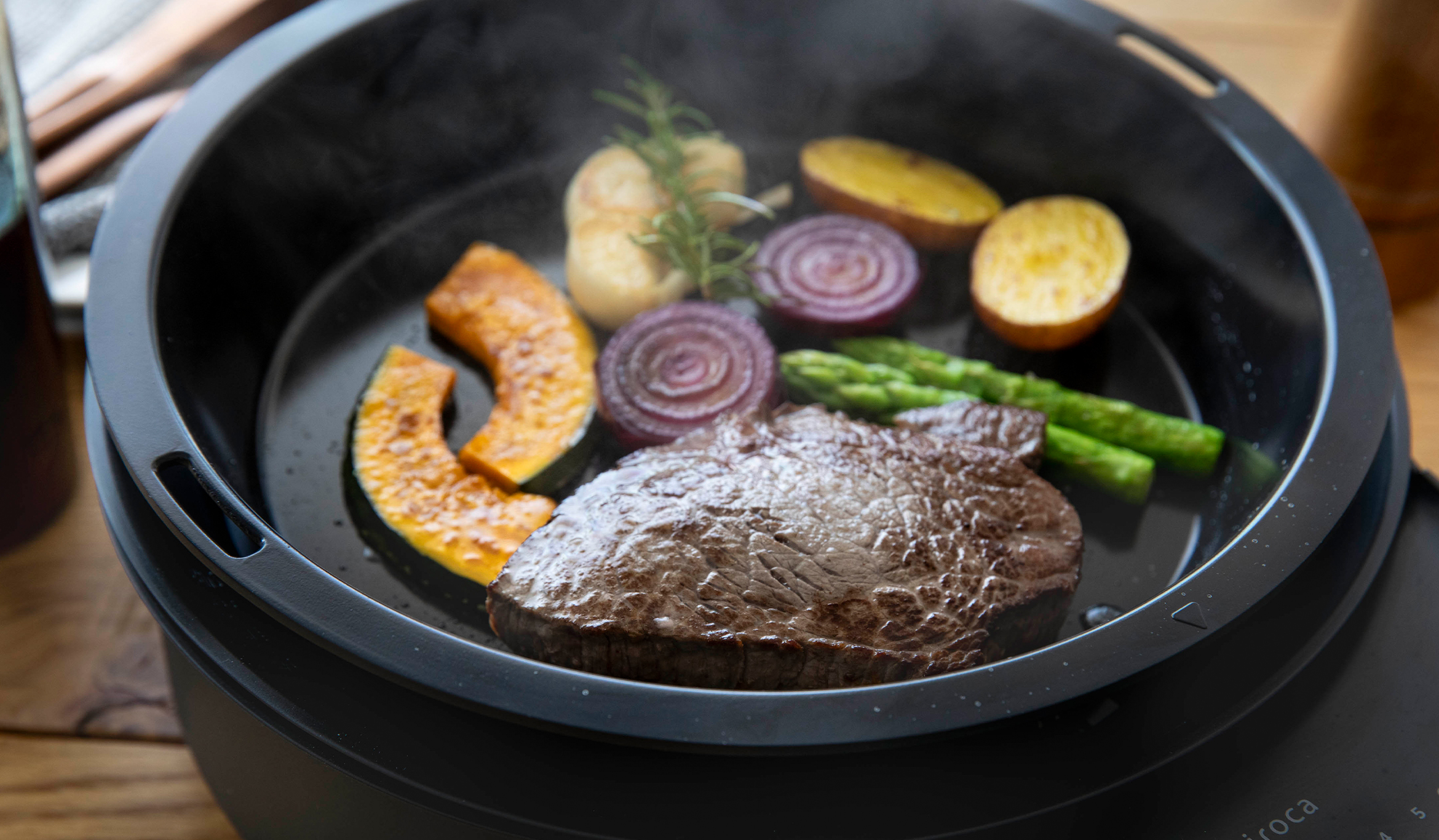 食材のおいしさを存分に引き出す蒸し皿(陶製すのこ)*高火力ヒーターと蓄熱性の高いプレート、