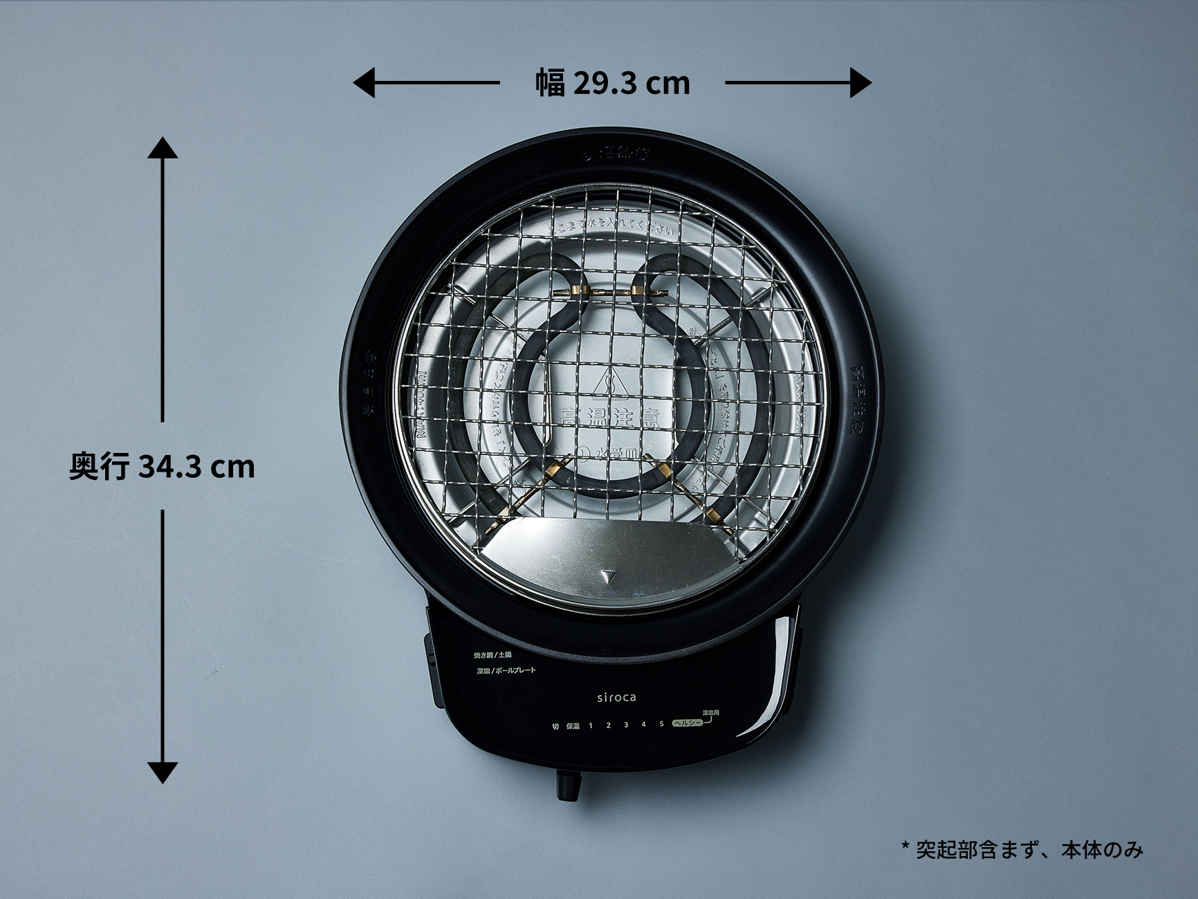 幅293 mm×奥行343 mm×高さ171.5 mm (突起部含まず) 本体のみ: 幅293 mm×奥行343 mm×高さ95.7 mm (突起部含まず) 焼き網: 直径239 mm×高さ18 mm 深皿: 直径289 mm×高さ69 mm ボールプレート: 直径230 mm×高さ43.4 mm ふた: 直径261 mm×高さ61.5 mm 土鍋* 直径260 mm(310 mm:取っ手部含む)× 高さ160mm *SQ-D151Dのみ付属 |